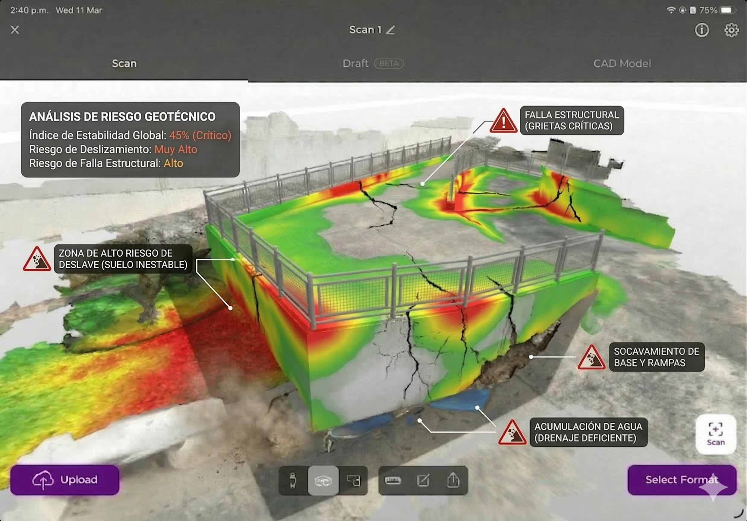 A continuación, encontrará el modelo 3D y el diagnóstico técnico del área a intervenir. Nuestro análisis preliminar ha identificado que el terreno presenta retos importantes por infiltración de agua subterránea y presiones laterales de expansión. Por ello, nuestra propuesta va más allá de una simple plancha superficial: integra un muro de contención monolítico con sistema de alivio hidrostático (desagües), garantizando que la nueva estructura soporte las cargas naturales del entorno sin riesgo de fracturas, hundimientos o colapsos.