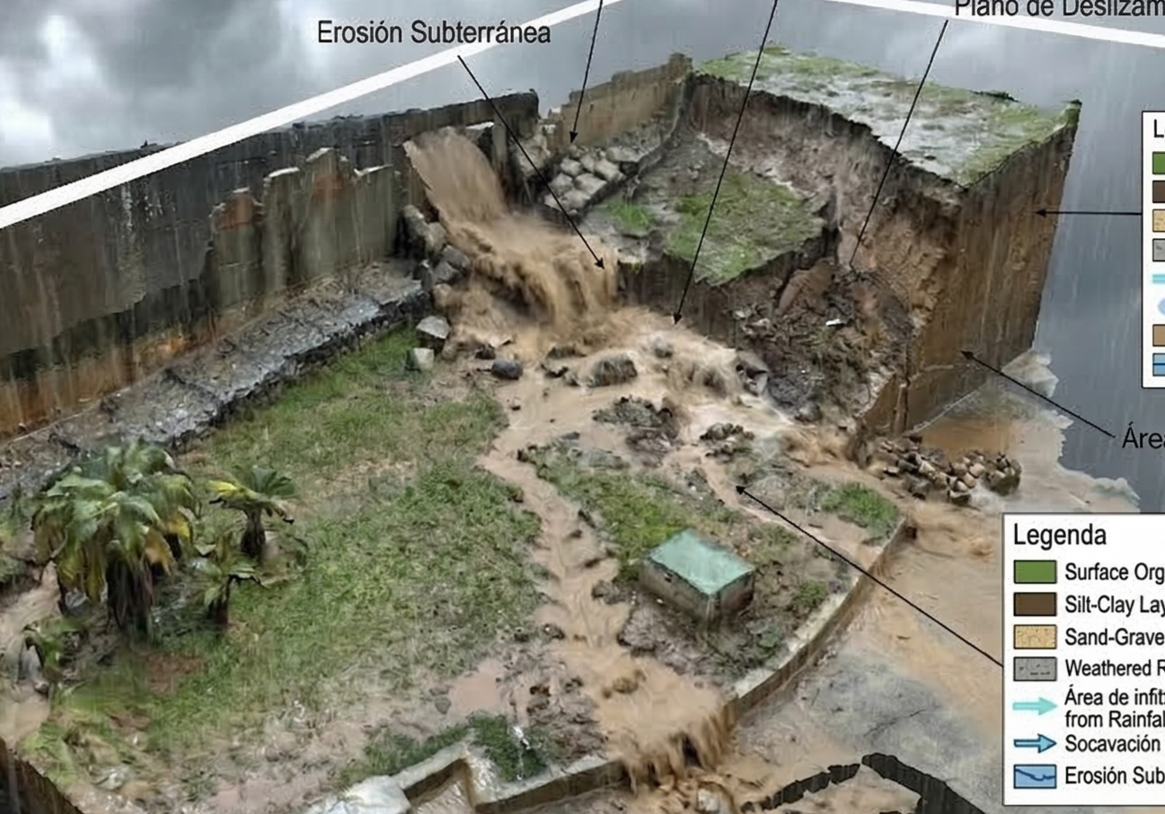 Infiltración Subterránea Inevitable: Por la naturaleza del terreno, existirá flujo de agua subterránea. Si el muro no se diseña con un sistema de alivio (desagües y lloraderos) en sus tres caras, la acumulación de agua actuará como una bomba hidráulica contra el concreto.