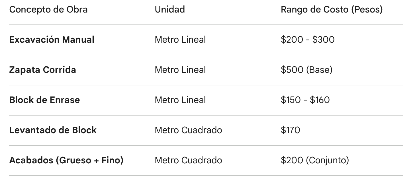 Para una barda estándar de 2.5m de altura, el costo operativo de mano de obra oscila entre $1,100 y $1,350 pesos por metro lineal, dependiendo de la complejidad del terreno y el nivel de acabado estructural requerido.