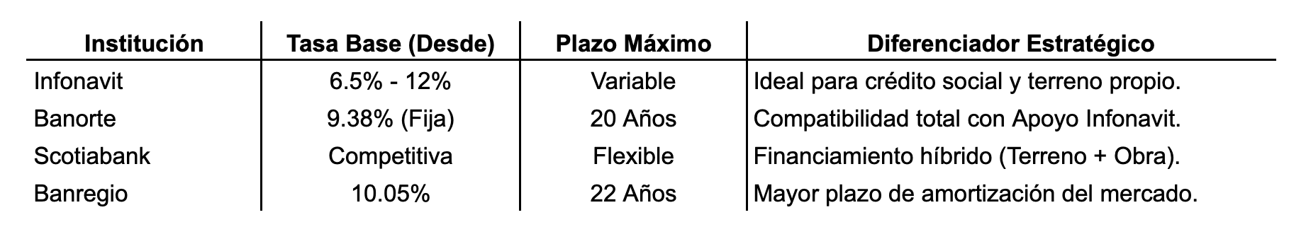 Para el derechohabiente moderno, el programa Construyo de Infonavit ha evolucionado para ofrecer tasas desde el 6.5%, una cifra sumamente competitiva frente a la banca comercial. Sin embargo, en proyectos de gran escala que gestionamos en NorthStone Group, la flexibilidad es reina. Aquí es donde entra la Hipoteca Fuerte de Banorte, con tasas desde el 9.38% y la posibilidad de integrar el Apoyo Infonavit, utilizando el saldo de la subcuenta de vivienda como garantía para potenciar el alcance de la obra sin descapitalizar al inversor.
