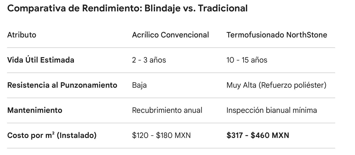 El precio promedio de la impermeabilización termofusionada de alta gama oscila entre $317 y $460 pesos por metro cuadrado. Este valor incluye preparación de superficie, primario asfáltico, suministro e instalación de manto de 4.0mm a 4.5mm y garantía estructural de NorthStone Group.